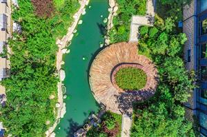 園區(qū)內(nèi)高達(dá)50%綠化率,1.1公里活水水系景觀貫穿園區(qū),水系配有跌水瀑布、觀景亭、休閑木平臺(tái),水系兩側(cè)配有喬灌草三層搭配,高低錯(cuò)落、層次立體分明。